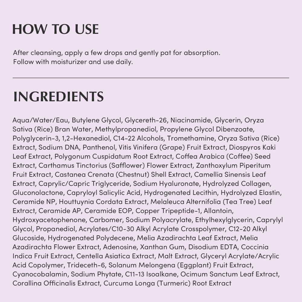 Purple Rice Extract: يحتوي على مضادات أكسدة أكثر بـ7 مرات من الأرز الأبيض، يعزز مرونة البشرة ويشد المسام.