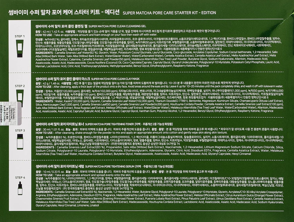 هي طقم متكامل مكوّن من أربع منتجات أساسية بحجم تجريبي، مصممة خصيصًا لعلاج مشاكل المسام الواسعة، الإفرازات الدهنية الزائدة، والرؤوس السوداء والبيضاء. المجموعة غنية بمستخلص الماتشا الكوري الفاخر المعروف بخصائصه المضادة للأكسدة والمهدئة للبشرة، بالإضافة إلى أحماض طبيعية مقشرة ومياه معدنية فوّارة لترطيب وتنقية البشرة بعمق.